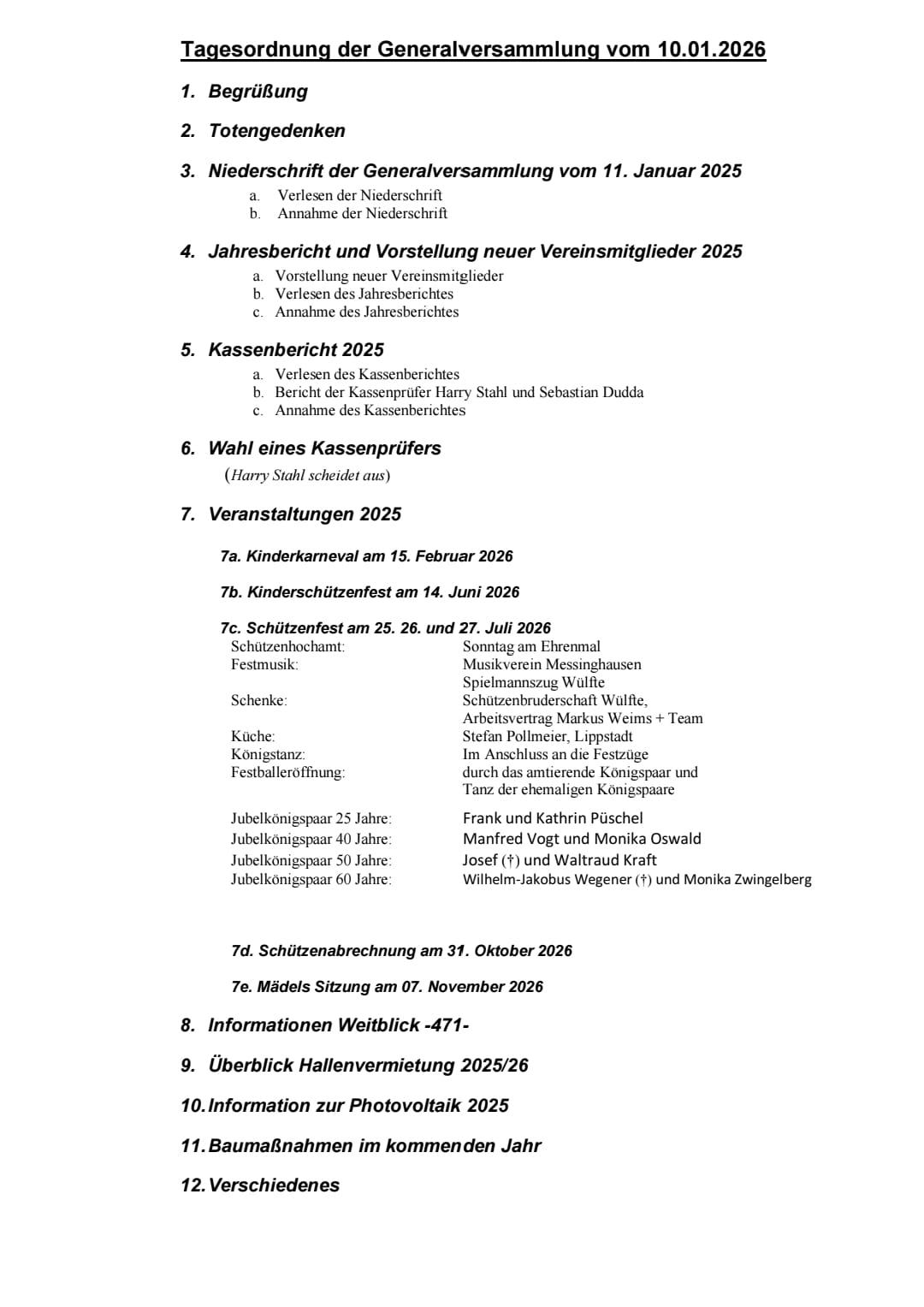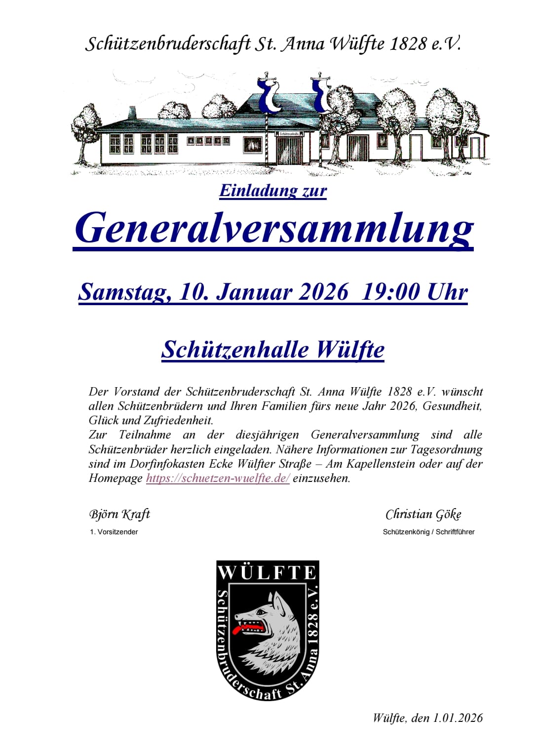 Am 11. Januar fand die Generalversammlung der Schützenbruderschaft St. Anna Wülfte statt. Der 1. Vorsitzende, Björn Kraft, begrüßte 66 Schützen, darunter den amtierenden Schützenkönig Tobias Ising,